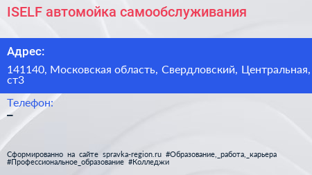 ISELF, автомойка самообслуживания по адресу 141140, Московская область, Свердловский, Центральная, ст3 в дальнейшем Организация, размещена в следующих категориях: