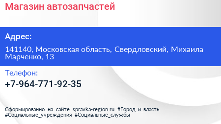 Магазин автозапчастей по адресу 141140, Московская область, Свердловский, Михаила Марченко, 13 в дальнейшем Организация, размещена в следующих категориях: