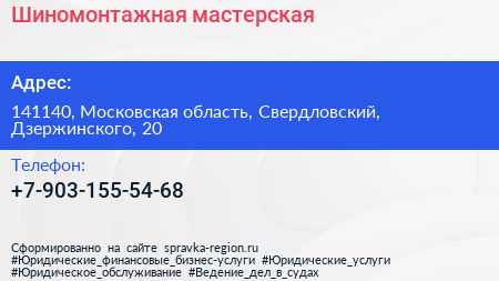 Шиномонтажная мастерская по адресу 141140, Московская область, Свердловский, Дзержинского, 20 в дальнейшем Организация, размещена в следующих категориях: