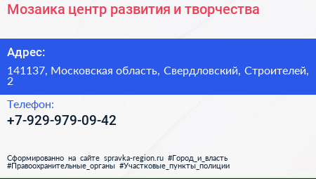 Мозаика, центр развития и творчества по адресу 141137, Московская область, Свердловский, Строителей, 2 в дальнейшем Организация, размещена в следующих категориях: