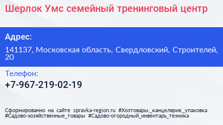 Шерлок Умс, семейный тренинговый центр по адресу 141137, Московская область, Свердловский, Строителей, 20 в дальнейшем Организация, размещена в следующих категориях:
