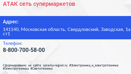 АТАК, сеть супермаркетов по адресу 141140, Московская область, Свердловский, Заводская, 1а ст1 в дальнейшем Организация, размещена в следующих категориях: