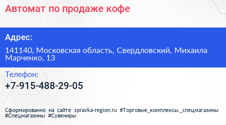Автомат по продаже кофе по адресу 141140, Московская область, Свердловский, Михаила Марченко, 13 в дальнейшем Организация, размещена в следующих категориях: