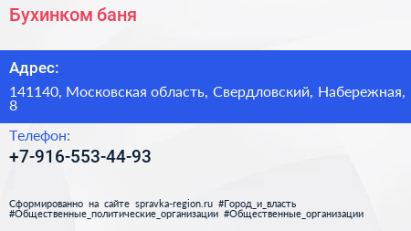 Бухинком, баня по адресу 141140, Московская область, Свердловский, Набережная, 8 в дальнейшем Организация, размещена в следующих категориях: