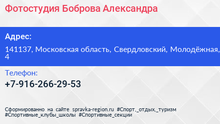Фотостудия Боброва Александра по адресу 141137, Московская область, Свердловский, Молодёжная, 4 в дальнейшем Организация, размещена в следующих категориях: