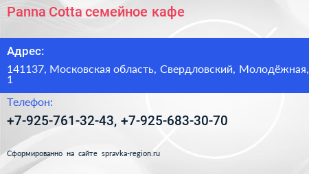 Panna Cotta, семейное кафе по адресу 141137, Московская область, Свердловский, Молодёжная, 1 в дальнейшем Организация, размещена в следующих категориях: