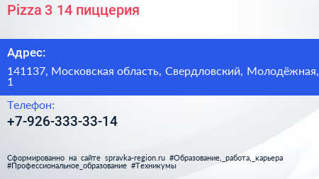 Pizza 3,14, пиццерия по адресу 141137, Московская область, Свердловский, Молодёжная, 1 в дальнейшем Организация, размещена в следующих категориях: