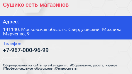 Сушико, сеть магазинов по адресу 141140, Московская область, Свердловский, Михаила Марченко, 9 в дальнейшем Организация, размещена в следующих категориях: