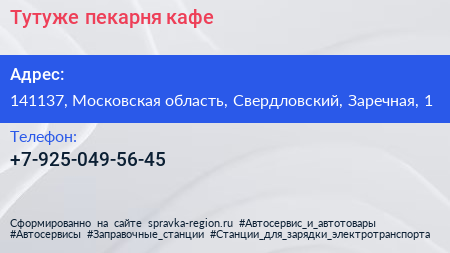 Тутуже, пекарня-кафе по адресу 141137, Московская область, Свердловский, Заречная, 1 в дальнейшем Организация, размещена в следующих категориях: