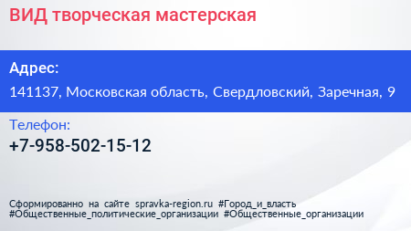 ВИД, творческая мастерская по адресу 141137, Московская область, Свердловский, Заречная, 9 в дальнейшем Организация, размещена в следующих категориях: