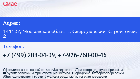 Сиас по адресу 141137, Московская область, Свердловский, Строителей, 2 в дальнейшем Организация, размещена в следующих категориях: