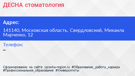 ДЕСНА, стоматология по адресу 141140, Московская область, Свердловский, Михаила Марченко, 12 в дальнейшем Организация, размещена в следующих категориях: