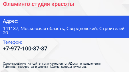 Фламинго, студия красоты по адресу 141137, Московская область, Свердловский, Строителей, 20 в дальнейшем Организация, размещена в следующих категориях: