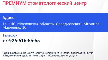 ПРЕМИУМ, стоматологический центр по адресу 141140, Московская область, Свердловский, Михаила Марченко, 10 в дальнейшем Организация, размещена в следующих категориях: