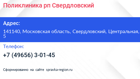 Поликлиника, рп. Свердловский по адресу 141140, Московская область, Свердловский, Центральная, 5 в дальнейшем Организация, размещена в следующих категориях: