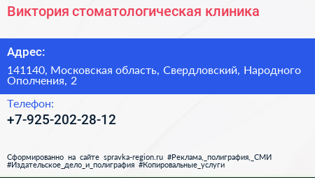 Виктория, стоматологическая клиника по адресу 141140, Московская область, Свердловский, Народного Ополчения, 2 в дальнейшем Организация, размещена в следующих категориях: