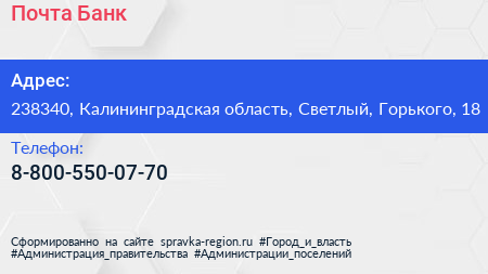 Почта Банк по адресу 238340, Калининградская область, Светлый, Горького, 18 в дальнейшем Организация, размещена в следующих категориях: