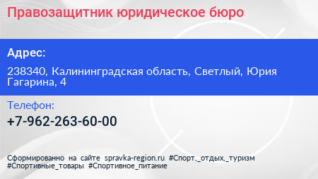 Правозащитник, юридическое бюро по адресу 238340, Калининградская область, Светлый, Юрия Гагарина, 4 в дальнейшем Организация, размещена в следующих категориях: