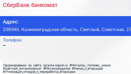 СберБанк, банкомат по адресу 238340, Калининградская область, Светлый, Советская, 27 в дальнейшем Организация, размещена в следующих категориях: