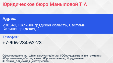 Юридическое бюро Маныловой Т.А. по адресу 238340, Калининградская область, Светлый, Калининградская, 2 в дальнейшем Организация, размещена в следующих категориях: