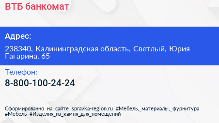 ВТБ, банкомат по адресу 238340, Калининградская область, Светлый, Юрия Гагарина, 65 в дальнейшем Организация, размещена в следующих категориях: