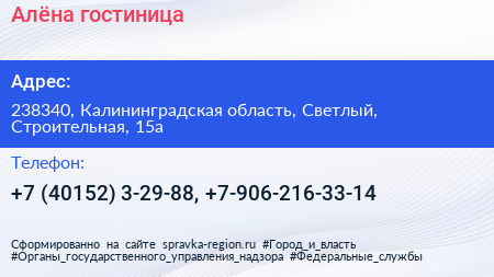 Алёна, гостиница по адресу 238340, Калининградская область, Светлый, Строительная, 15а в дальнейшем Организация, размещена в следующих категориях: