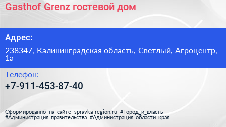Gasthof Grenz, гостевой дом по адресу 238347, Калининградская область, Светлый, Агроцентр, 1а в дальнейшем Организация, размещена в следующих категориях: