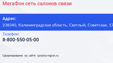 МегаФон, сеть салонов связи по адресу 238340, Калининградская область, Светлый, Советская, 17 в дальнейшем Организация, размещена в следующих категориях: