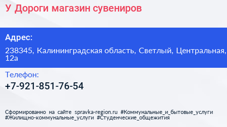 У Дороги, магазин сувениров по адресу 238345, Калининградская область, Светлый, Центральная, 12а в дальнейшем Организация, размещена в следующих категориях: