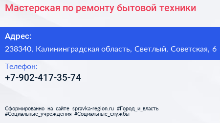 Мастерская по ремонту бытовой техники по адресу 238340, Калининградская область, Светлый, Советская, 6 в дальнейшем Организация, размещена в следующих категориях: