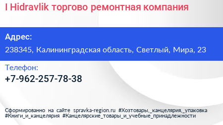 I Hidravlik, торгово-ремонтная компания по адресу 238345, Калининградская область, Светлый, Мира, 23 в дальнейшем Организация, размещена в следующих категориях: