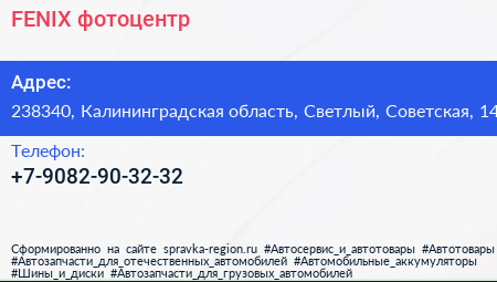 FENIX, фотоцентр по адресу 238340, Калининградская область, Светлый, Советская, 14 в дальнейшем Организация, размещена в следующих категориях:
