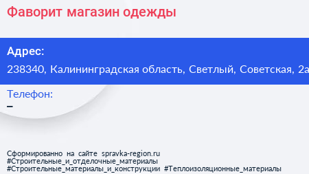 Фаворит, магазин одежды по адресу 238340, Калининградская область, Светлый, Советская, 2а в дальнейшем Организация, размещена в следующих категориях: