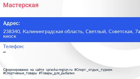 Мастерская по адресу 238340, Калининградская область, Светлый, Советская, 7а киоск в дальнейшем Организация, размещена в следующих категориях: