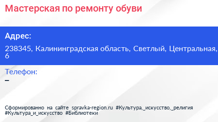 Мастерская по ремонту обуви по адресу 238345, Калининградская область, Светлый, Центральная, 6 в дальнейшем Организация, размещена в следующих категориях: