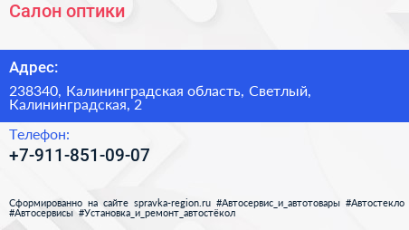 Салон оптики по адресу 238340, Калининградская область, Светлый, Калининградская, 2 в дальнейшем Организация, размещена в следующих категориях: