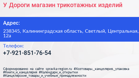 У Дороги, магазин трикотажных изделий по адресу 238345, Калининградская область, Светлый, Центральная, 12а в дальнейшем Организация, размещена в следующих категориях: