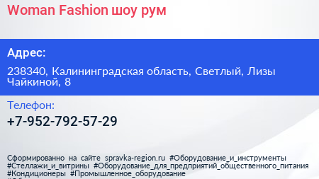 Woman Fashion, шоу-рум по адресу 238340, Калининградская область, Светлый, Лизы Чайкиной, 8 в дальнейшем Организация, размещена в следующих категориях: