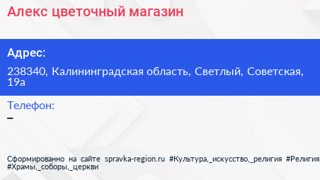 Алекс, цветочный магазин по адресу 238340, Калининградская область, Светлый, Советская, 19а в дальнейшем Организация, размещена в следующих категориях: