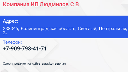 Компания, ИП Людмилов С.В. по адресу 238345, Калининградская область, Светлый, Центральная, 2а в дальнейшем Организация, размещена в следующих категориях: