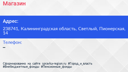 Магазин по адресу 238741, Калининградская область, Светлый, Пионерская, 14 в дальнейшем Организация, размещена в следующих категориях: