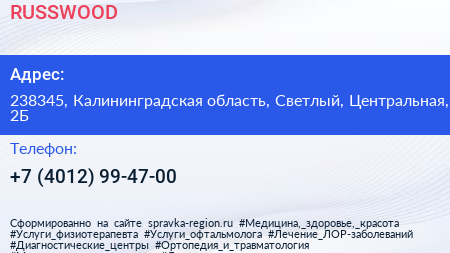 RUSSWOOD по адресу 238345, Калининградская область, Светлый, Центральная, 2Б в дальнейшем Организация, размещена в следующих категориях: