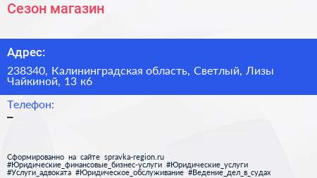 Сезон, магазин по адресу 238340, Калининградская область, Светлый, Лизы Чайкиной, 13 к6 в дальнейшем Организация, размещена в следующих категориях: