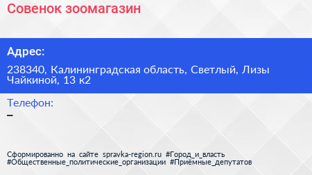 Совенок, зоомагазин по адресу 238340, Калининградская область, Светлый, Лизы Чайкиной, 13 к2 в дальнейшем Организация, размещена в следующих категориях: