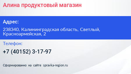 Алина, продуктовый магазин по адресу 238340, Калининградская область, Светлый, Красноармейская, 2 в дальнейшем Организация, размещена в следующих категориях: