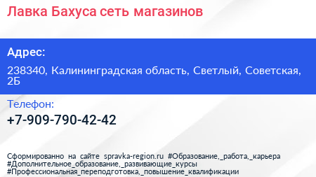 Лавка Бахуса, сеть магазинов по адресу 238340, Калининградская область, Светлый, Советская, 2Б в дальнейшем Организация, размещена в следующих категориях: