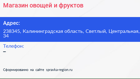 Магазин овощей и фруктов по адресу 238345, Калининградская область, Светлый, Центральная, 34 в дальнейшем Организация, размещена в следующих категориях:
