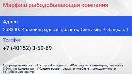 Марфиш, рыбодобывающая компания по адресу 238340, Калининградская область, Светлый, Рыбацкая, 1 в дальнейшем Организация, размещена в следующих категориях: