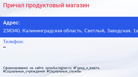 Причал, продуктовый магазин по адресу 238340, Калининградская область, Светлый, Заводская, 1а в дальнейшем Организация, размещена в следующих категориях: