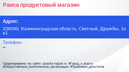 Раиса, продуктовый магазин по адресу 238340, Калининградская область, Светлый, Дружбы, 1а к1 в дальнейшем Организация, размещена в следующих категориях: